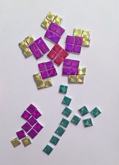 Но пост не совсем об этом - вчера Дюймовочка прямо-таки потребовала, чтобы мама придумала и нарисовала ей мозаику, вотпрямщас и никак иначе. Пришлось на ходу придумывать из остатков от набора. Принципиальными были блестящие кусочки.
