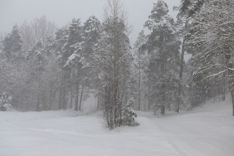 Всю неделю валил снег. Температура радовала спокойным минусом. Но вот вдруг резко потеплело до +2. Утром встала, а на улице мгла, похожая на серый туман. Нет границы между небом и снегом. Совершенно непрозрачная метель снежного крошева в воздухе. Наш дом не просматривается за деревьями.