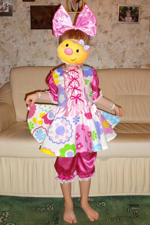Был сшит на заказ и уже радует маленькую хозяйку. Выкройка, как обычно, моя. Креп-сатин, хлопок, сетка, ажурная резинка, шляпная резинка, атласная лента, фатин, стразы. Костюм из трех предметов - платье с пришитым подъюбником, штанишки-панталоны и бант на ободке. Сзади атласный пояс завязывается на бант. Фото на заказчице. Это моё любимое - придумывать и шить новогодние костюмы :) Первый раз полностью самостоятельно я сшила новогодний костюм в 13 лет :)