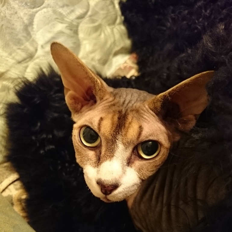 Кот- это чудо природы, канадский сфинкс, он не лысый, а велюровый, и когда гладишь, сразу вспоминается бархатная бумага, из которой в советское детство мы делали открытки маме на 8ое марта