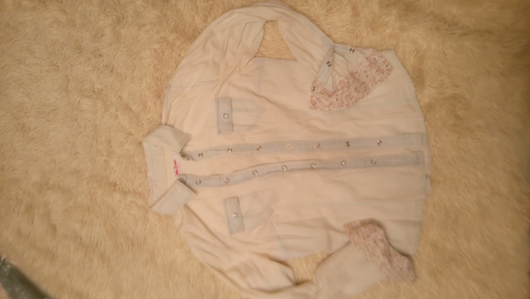 --любимая рубашка из нежно голубой тонкой джинсы с пестренькими отворотами, состаренная, на кнопках, очень активно ношена, меняли здесь, может еще кому послужит, 200руб