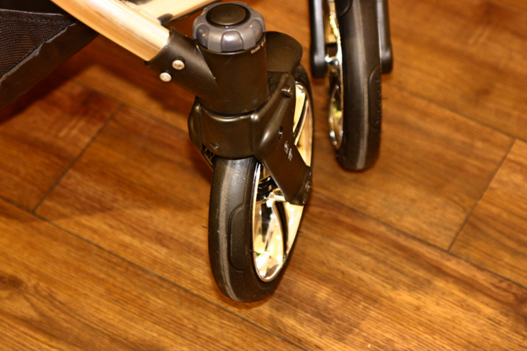 Колеса у Вениччи большие, бескамерные - по снегу едут отлично (но поворотные лучше все же фиксировать). Благодаря мягкой подвеске и хорошей амортизации коляску абсолютно не трясет, управлять ей одно удовольствие.