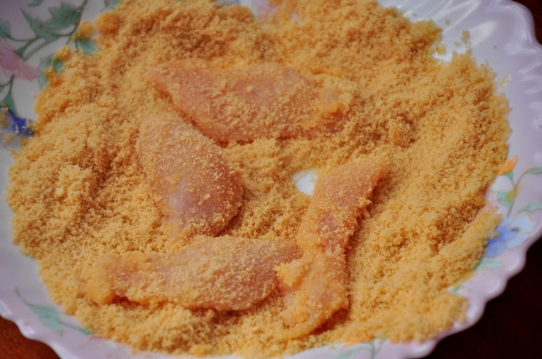 Обвалять рыбу в панировке и обжарить на растительном масле. Положить поджаренную рыбную палочку на овощи и полить соусом: