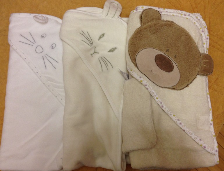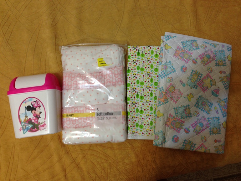 И мелочи: муслиновые салфетки (250 рублей),полотенца (99 рублей), контейнеры для хранения гигенических мелочей (599 рублей), клеенки для смены подгузников ( по 150 рублей за штуку) и контейнер для мусора (70 рублей):