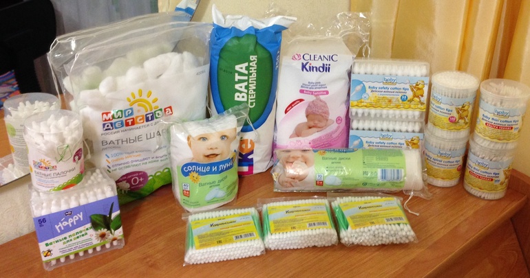Ватные палочки(разных диаметров, сограничителем и без), ватные диски (разных размеров) и вата: