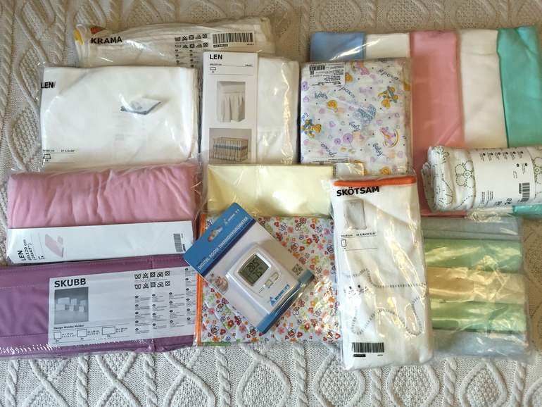12. Подзор для кроватки, Икеа. Нужен, чтобы замаскировать под кроватью коробку, куда будем складывать неначатые упаковки подгузников.