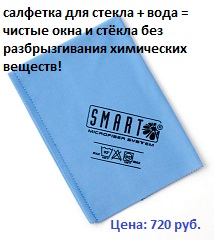 Мытье окон - одна из тяжелейших домашних работ. При мытье хозяйка обычно выполняет 4 операции: разбрызгивает химическое вещество, растирает его по поверхности, смывает водой и вытирает поверхность стекла насухо. Средства для мытья стекол высокотоксичные, а газета, которую по традиции используют для протирки, содержит крайне опасный свинец. Салфетка из микроволокна, произведенная компанией SMART, позволит вам помыть окно в один подход! Слегка увлажните салфетку, т.е. намочите и сильно отожмите, и протирайте стекло примерно так, как протирали классную доску в школе. Окно покроется легким туманом, который через несколько секунд рассеется и вы получите идеально чистое стекло. Количество времени, затраченного на работу, уменьшается, а качество - возрастает. К тому же вы больше не соприкасаетесь с вредной химией. Салфеткой можно протирать зеркала, мебель,а также пылевые отложения с любых поверхностей.