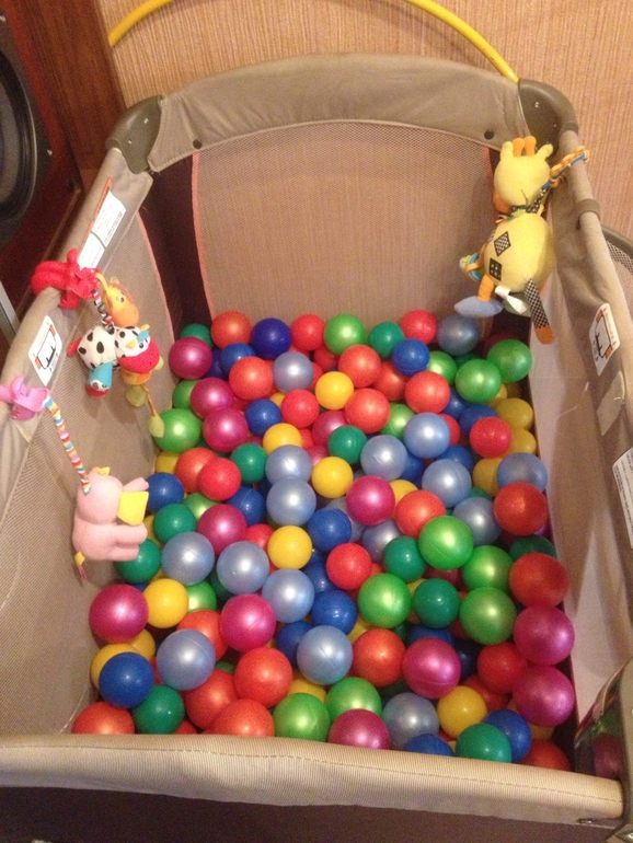 Наш наотрез отказался. Пришлось по совету знакомой сделать сухой бассейн. Здесь 300 шариков двух размеров. Пользуемся практически ежедневно вот уже больше полутора лет. И думаю еще долго пользоваться будем :).