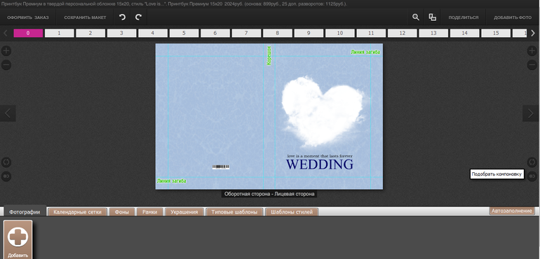 Также присутствует возможность добавления рамок, шаблонов. Все они неплохо прорисованы и сами по себе интересные. Сами загружаемые фото можно редактировать в процессе создания разворотов. По итогу можно просмотреть готовый альбом. Кстати, именно этот конечный этап реализован очень правильно. Заказчик видит то, что он сделал и как это будет выглядеть.