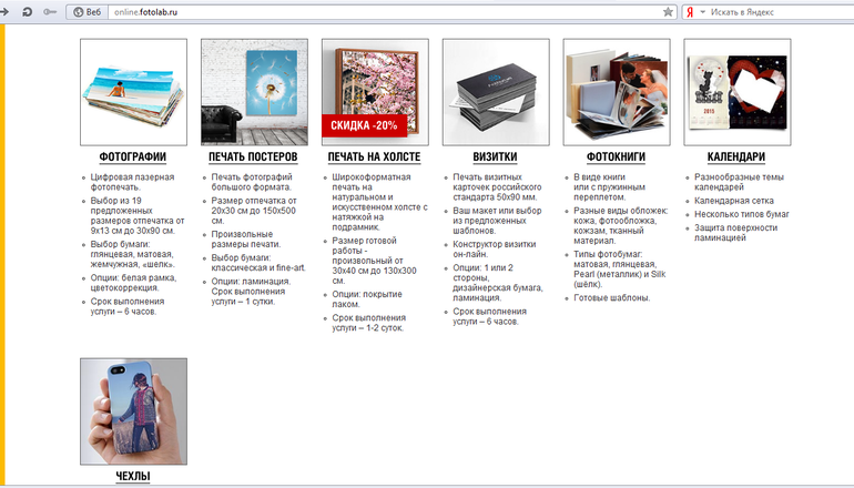 Итак, что касается самого интерфейса,то тут все достаточно просто. Перед нами открывается сразу 7 вариантов. Это печать фото, постера, календаря, визитки, фотокниги, холста и печать на чехле. Не так уж и много.