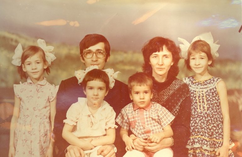 2. Я из многодетной семьи. У меня 2 брата и 2 сестры. На фото только младшего брата не хватает. Я у папы на коленях.