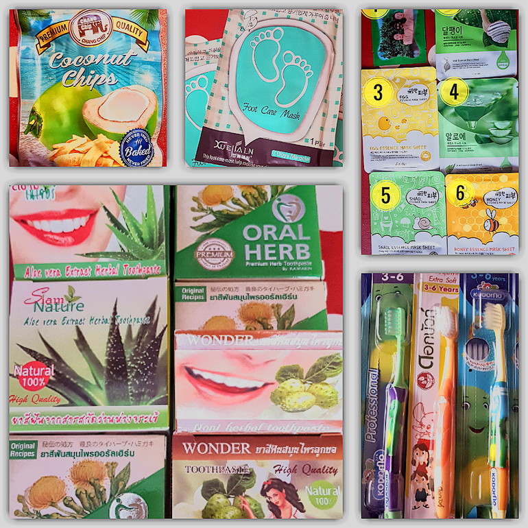Детские зубные щетки, взрослые знаменитые зубные пасты обеззараживающие и отбеливающие, ингаляторы-мазалки от головной боли, насморка и инфекций, набор из 6 масок, носочки для пяточек, кокосовые чипсы, мармеладки от боли в горле.