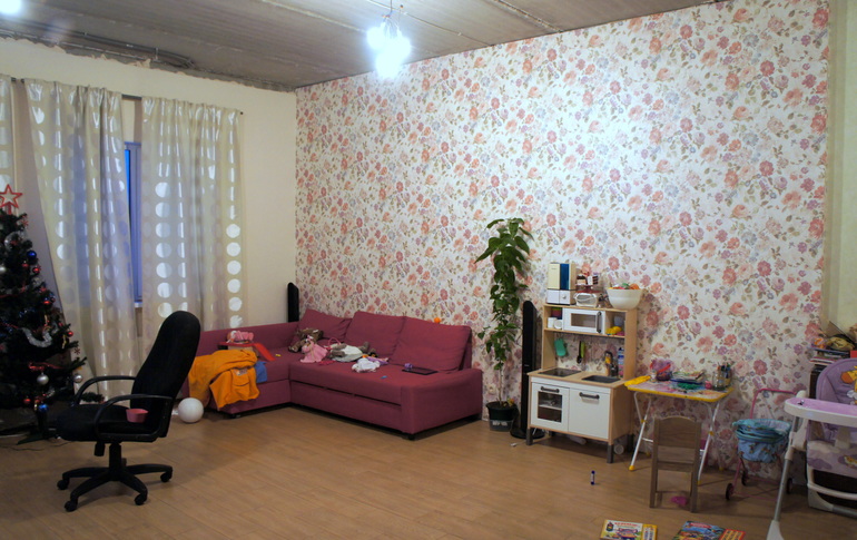 2 января мы все таки прикупили обои. И начали клеить. И клеили до 7 января, заканчивая в 1-2 ночи. У меня до сих пор кожа с пальцев сходит... для меня это было тяжко конечно. Зато первый этаж преобразился. Осталось натянуть потолки. Еще интересно я выбирала обои, одну стену я хотела в цветах, выбрала уже рисунок. Поехали в Максидом, там только 1 рулон, а нам нужно 2! Ну что же поехали в др Максидом и там я нашла то, что хотела. Но, подняв глаза, я увидела другие цветы =) и решила - вот они. И сейчас я смотрю и думаю - это был правильный выбор!