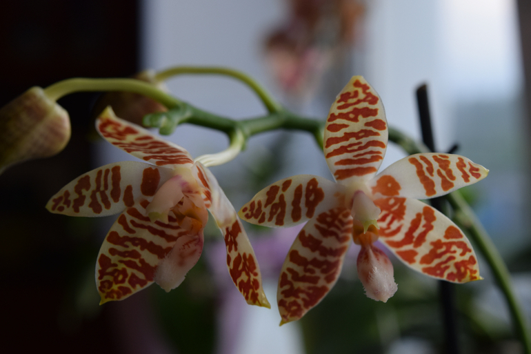 А с ним соседствует неподалеку орхидея Дикий персик, купленный летом с одним цветоносом.