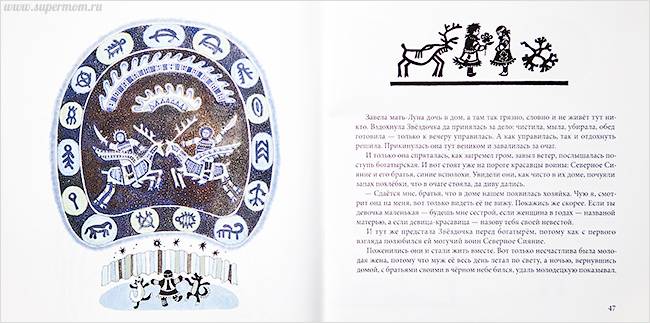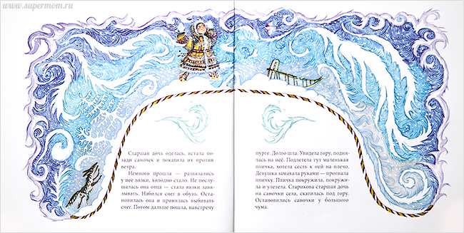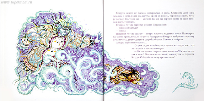 Это сказки о северных народах со всем подобающим колоритом. В книге всего две сказки: "Хозяин Ветров" и "Сказка о лунной дочери". Первое, что хочется отметить - это потрясающие колоритные иллюстрации, которые гармонично сочетаются с текстом!