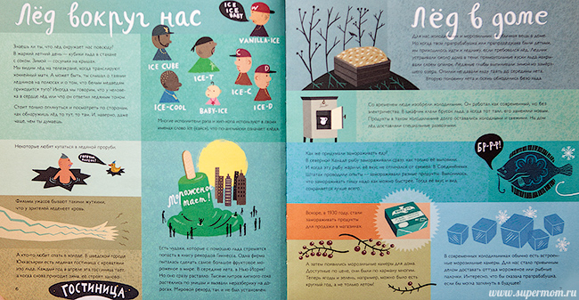 Эта книжка была куплена в подарок мальчишке пяти лет. Книга еще не подарена, но вот что хочу сказать: 45 страниц фактов про лед - это круто. Очень разносторонне рассматривается тема льда, начиная с того, как образуются сосульки, почему хрустит снег, что такое иней и наледь, почему лед не тонет и как изобрели холодильник, и заканчивая тем, как вести себя на льду и не провалиться в полынью, и что делать, если все-таки угораздило там оказаться.