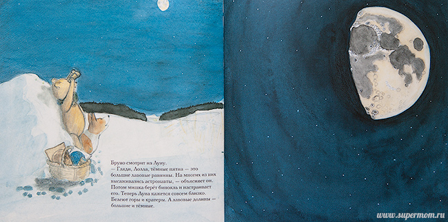 Единственное, что я, пожалуй, не поняла, почему на каждое мишкино действие отдали не больше разворота, а на любовь к звездам - целых три и форзац в придачу? Вот мой кроха заинтересовался следами на снегу и растопкой печки, и тут раз - про Сириус, лунные кратеры и карты звездного неба. Но если не придираться, то книга ми-ми-милейшая и очень уютная!
