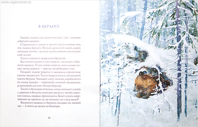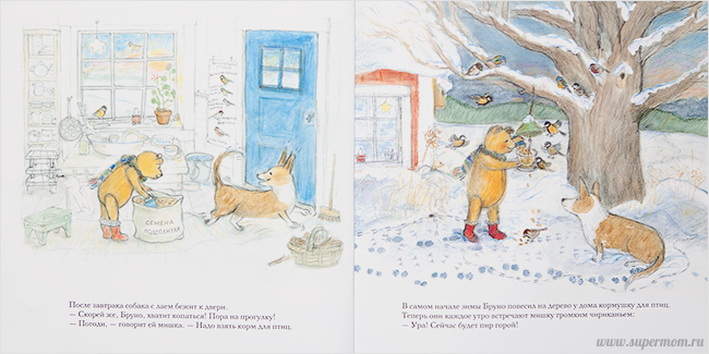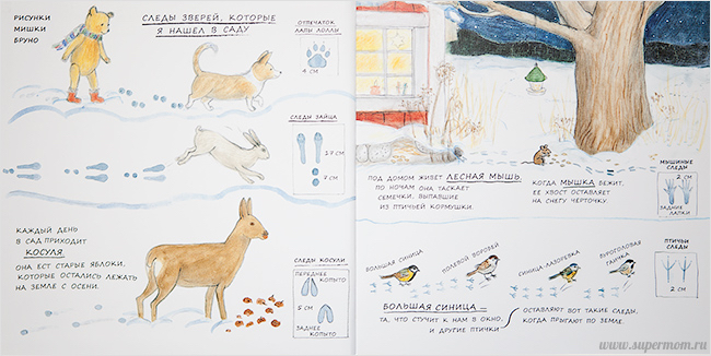 Мишка кормит птичек и зарисовывает следы зверей, топит печку и готовит блинчики - все это невероятно уютно проиллюстрировано на страницах книги.