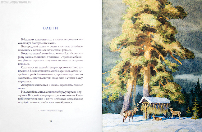 Это очень хорошая, хотя и очень простая в исполнении книга в мягкой обложке и на офсетной бумаге, здесь собраны 11 коротких историй о животных нашей полосы, по одной на развороте, и к каждой истории прилагается иллюстрация - настоящая картина маслом.