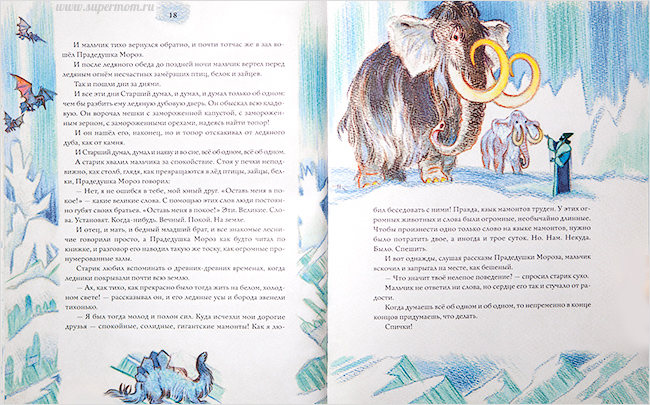 Сказка очень самобытна, легко читается, очень приятный язык изложения, который приковывает маленького слушателя к книге, однако, что мне не понравилось в сказке, так это то, что отрицательным героем здесь является Прадедушка Мороз. Не прадед, не старик, не злой колдун, а именно прадедушка. В моем понимании прадедушка - это кто-то очень родной и добрый, а тут скверный тип, замораживающий лесных зверей и похищающий детей. Правда, дети воспринимают сказочную реальность по-другому, и у Алисы ни на секунду не возникло вопросов о том, почему это Мороз так не по-людски себя ведет. Ей книга понравилась.