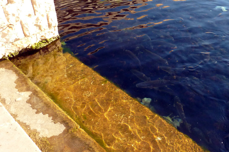Если отойти от пляжа, там есть пруд (цивильный в граните, с колоннами, ступеньками), где живут карпы в большом количестве и утки.