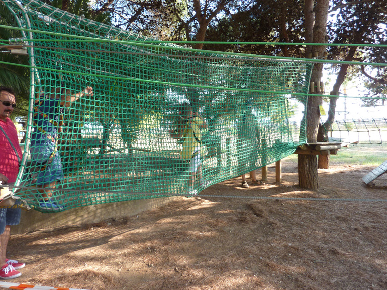 Парк чудесный, хвойный, там пахнет смолой и шишками! При входе бар, туалет, столики под открытым небом и фургончик с блинами. Тут же первая ступень парка Diver: верёвочный парк для детей от 4 до 7 лет Infantil, высота тропы - 1 м, страховка и прыгательный карабин, 3 тарзанки, 30 минут 1 круг за 7 евро, два круга подряд - 10 евро. По-английски говорят плохо, по-русски тоже, но пару слов могут выдавить. Там лишь один парень был, Дэвид, вот он очень прилично говорил! На английском легко, и даже немножко по-русски. Девочки там вообще никак, так что выучить слова типа "сал!" и "рохо" надо %). Для тех, кто старше и выше 130 см есть ещё 3 трассы - это надо пройти по мостику или по зебре через автомобильную дорогу. Я вот тоже на старости лет полезла на веохотуру %) Первая трасса, Блау уно (почему смесь немецкого и испанского - я не знать) - 10 евро, почти копия детской тропы, но на высоте 2 метра над землёй, страховка двойная, плюс тарзанка-карабин. Прикольная штука, надо будет в Москве сходить, жаль, что детские зоны от нас далековато :(