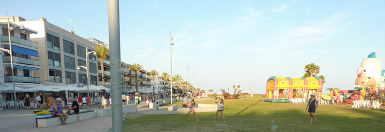 Большинство народу приходит со своими зонтами и подстилками. Зонты от 10 евро (из нетканой ткани простенькие, но на пару недель хватит), "скатерти" ещё ходят по пляжу дядьки продают, бывают гигантские и оч красивые... От 8 евро размера полотенца, до 20 громадная.