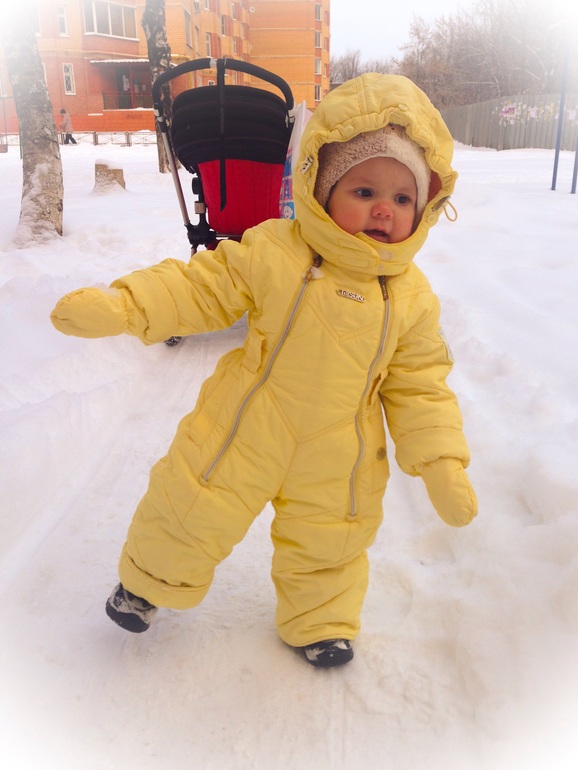 * Как только увидит комбез, начинает пищать, как морская свинка. )) На прогулке в коляске сидеть не хочет, любит ходить, падать, ловить за хвост дворовых котов, качаться на качелях..