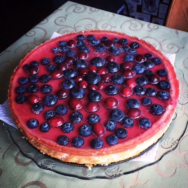 26 декабря Лиде исполнилось 2 месяца и я решила-таки сходить "проставиться" за рождение ребенка на работу. Данил (сын мужа) гулял с коляской, пока я бегала, благо - живем рядом) тот же сырно-бисквитный торт, только я почему-то неправильно рассчитала количество желе)))) получился пирог))) в качестве ягод - голубика и какая-то нереальных размеров клюква)