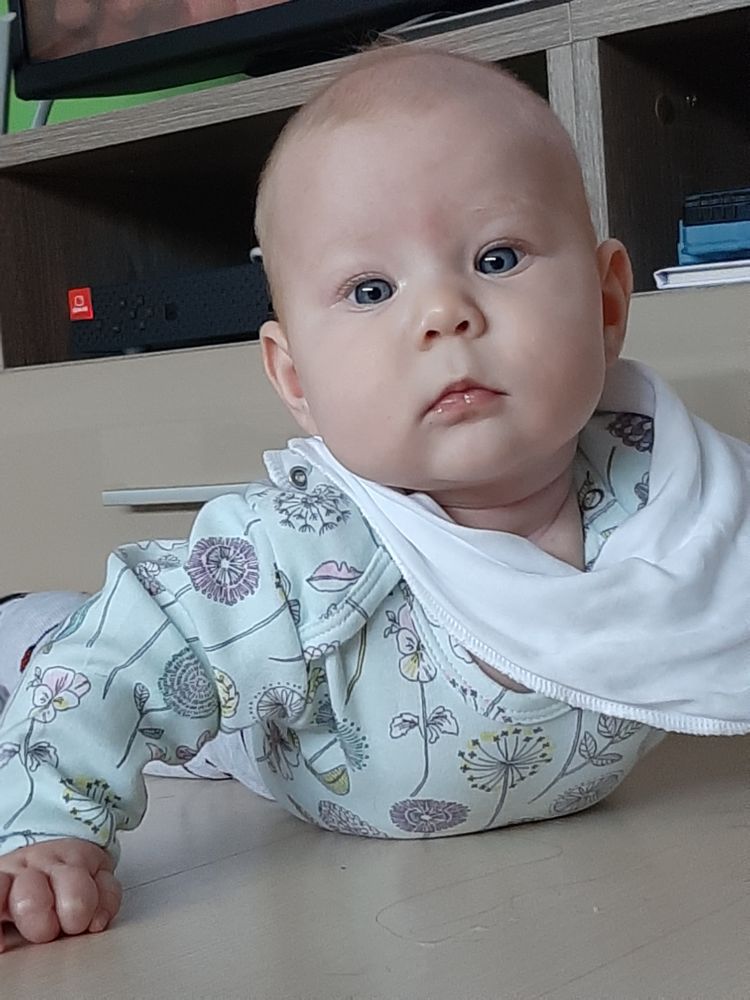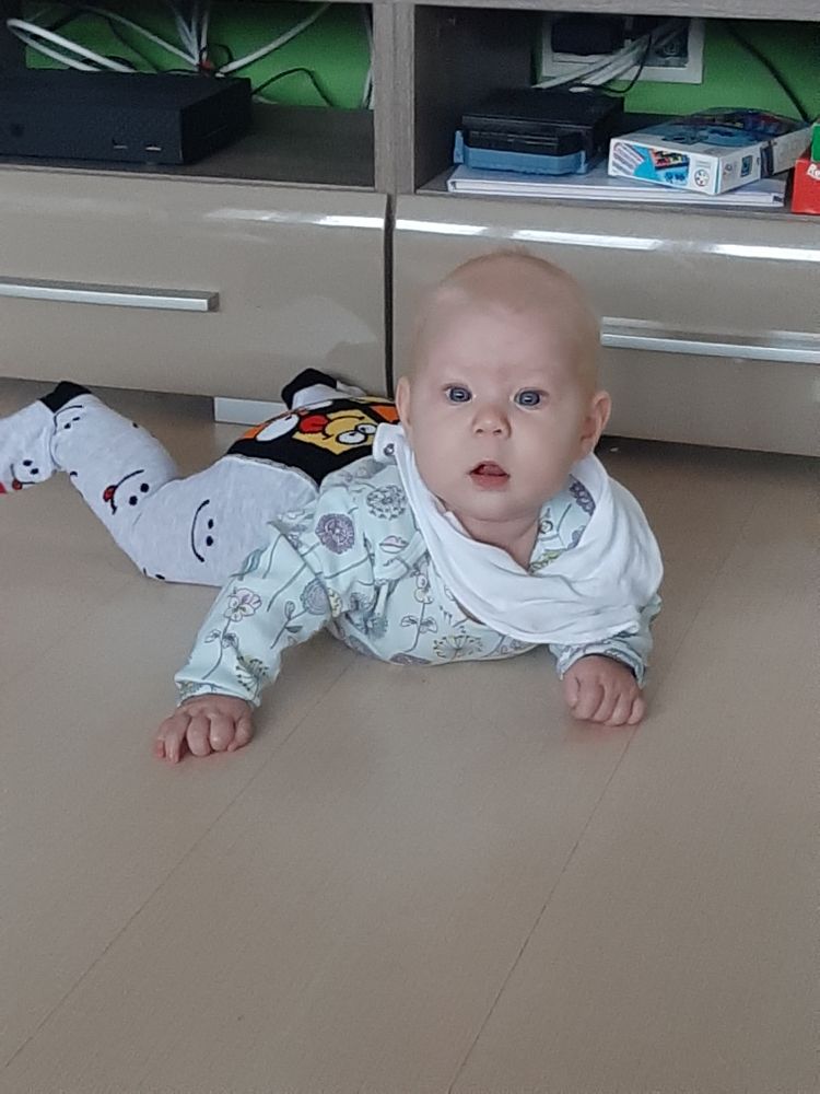 Ползает везде. Недавно мою посуду, слышу маньячное сопение рядом. Из-за угла моська вылезла. И подсматривает. Засекла, что передвигается она на руках. Подтягивается или гребет ручками. Ноги пока хаотично двигаются или болтаются в воздухе ))) Так что мы одолели ползанье на пузе задом и передом, перекаты со спины на живот и тд. И теперь следуем за мамой везде в пределах зала, а он у нас метров 70кв. Активно пытается встать на колени. Но попец тяжеловат пока. Но отрывается от земли уже. Тоже достижение.