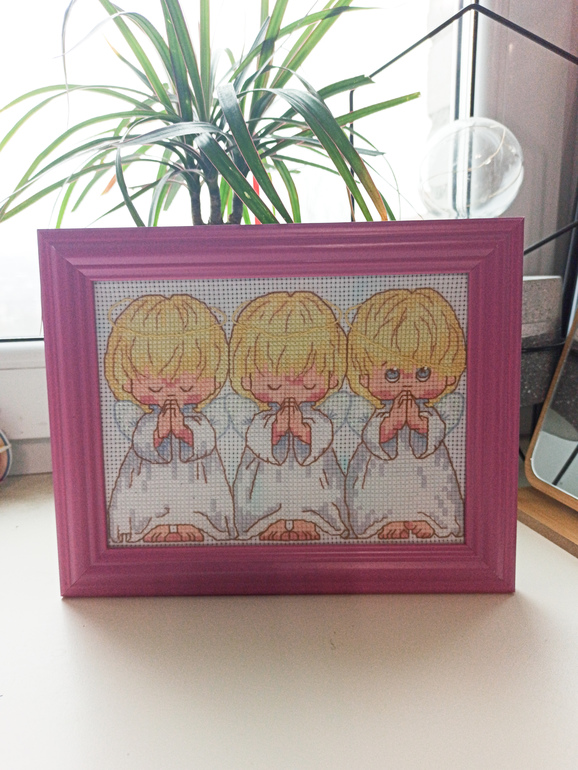Несколько недель назад услышала про вышивку "три ангела, почти идеальный". Я никогда не вышивала, только в школе. Но решила а почему бы и нет? Заказала, получила, начала вышивать. Потихоньку, не спеша, на сколько позволяло время. Вышивала и просто верила. Вчера закончила вышивать первого ангелочка