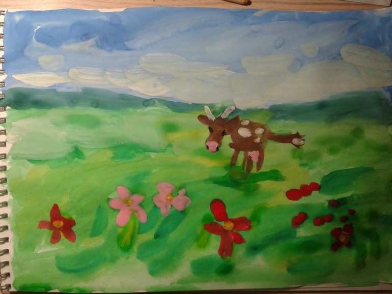 1. ИЗО. Для меня это возможность учить Влада рисовать. Корову пробовали на отдельном листе. Тема: "На лугу"