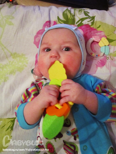 Начали резаться зубки.Стал кусаться и грызть все подряд.Прорезователем скребет по деснам,что на всю квартиру стоит скрип от соприкосновения резины с деснами))Часто хнычет,ночью плохо спит,просыпается каждые 2 часа.Слюни текут РУЧЬЕМ!!!Приходится постоянно переодевать,т.к. даже слюнявчик не справляется.