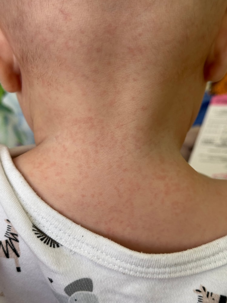 Вчера вечером на теле ребенка появились красные прыщики. Из нового вчера утром ели персик,но не думаю что на него,т.к до этого ели его в банках. Или все таки на него? До этого была потничка,но совсем чуть-чуть в области шеи,а сейчас эти прыщики на шее,на спине,немного на животе,немного на личике,а после ночи появились и в районе подгузника. Читала тут про розеолу,и симптомы схожи,была температура 3 дня,потом резко прошла и эти прыщики появились..Может все таки она? Но у нас вылез зуб,так что температуру списываю на него. Побежали сегодня к врачу,ничего толкового не сказала,прописала таблетки Фенкарол,и сказала придти на осмотр в пятницу.