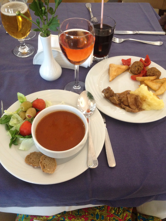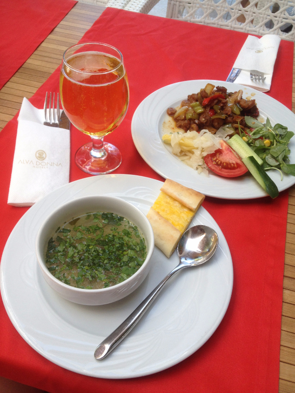 В ресторане на пляже «Ala Turka» с 12:30 обед и потом поздний ужин там. Блюд по- минимому, но также есть суп, 2 вида мяса, всегда что-то одно рыбное, 2-3 вида гарнира, тоже выпечка, которая меняется через пару часов, делают потом по нашески крошку-картошку, шаурма.