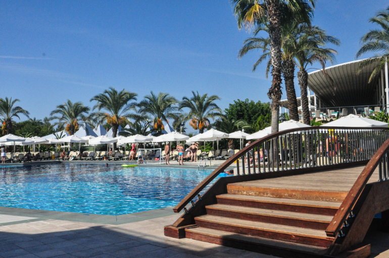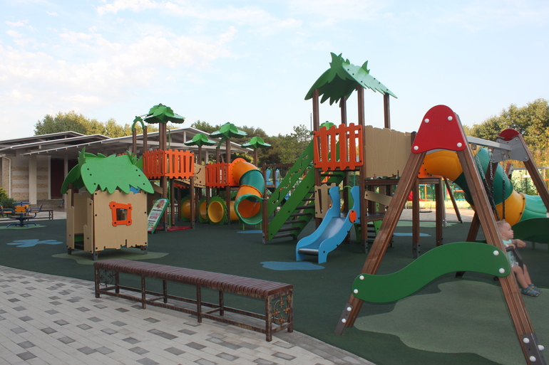 Есть детский уголок на территории отеля: горки, качели, 2 батута - огромные и поменьше. Все в хорошем и рабочем состоянии. Бассейн в детской зоне, где детские горки еще один, бассейн мини-где взрослые горки (рядом с бунгало), и большой главный бассейн (красивый мостик). Детский центр есть, где с детьми занимаются. А также при нем большая детская площадка с горками и прочими радостями для детишек.