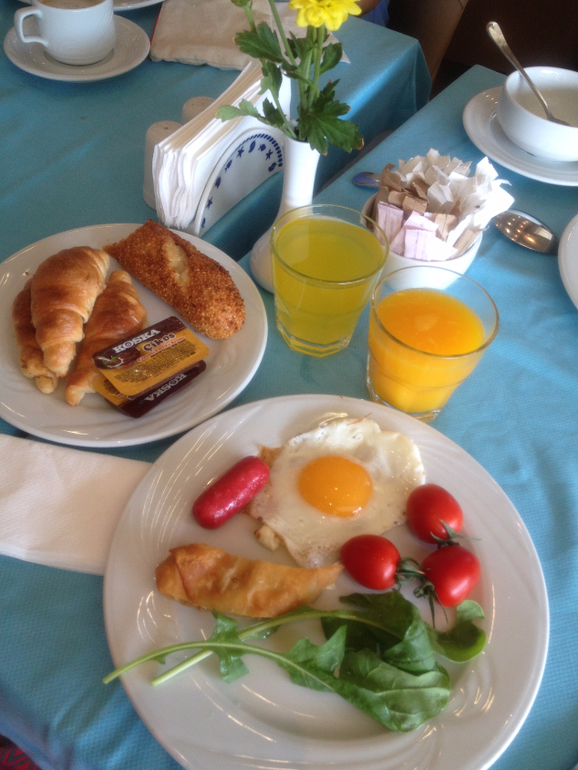 На завтрак в главн.ресторане «Панорама» встречают с бокалом шампанского (по вкусу как Асти Мартини все шампанское у них там), красная рыба)))