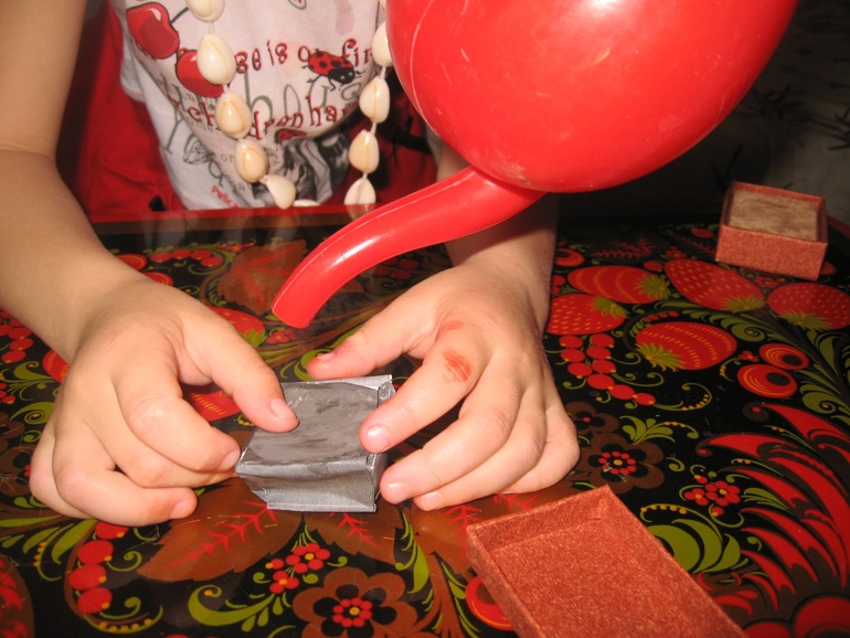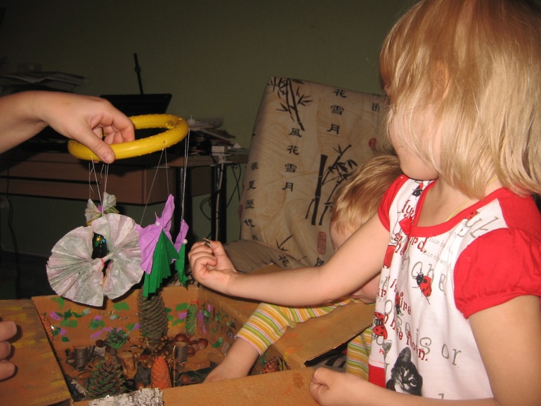 Вечером ели вафельный торт. Лида объявила папе, что это в честь «Праздника посадки тюльпанов». Вафельный, потому что дочь сказала что у вафель ячейки похожи на соты. А феи любят сладенькое. Потом играли сенсорной коробочкой. Оказалось, что Тима запомнил много новых названий растения: рябину, дуб, желуди. Они кормили птичку и фей. Дули на мобиль из фей - «помогали им танцевать» и танцевали сами.