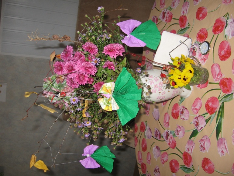 А потом играли в ласточек гоняющихся за мухами и слепнями. С феями Лида расставаться не желает. Поэтому развесили их на наш обновленный букет.