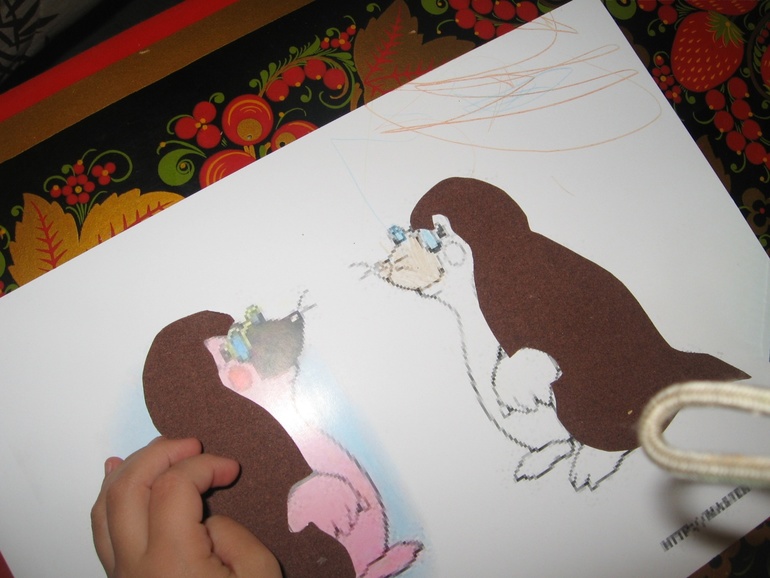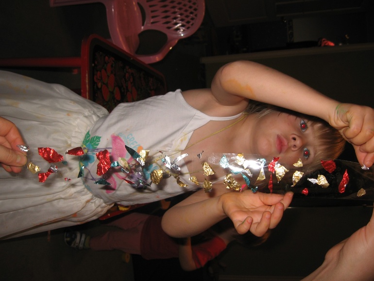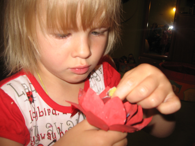 Лиде понравился процесс разрезания фольги на мелкие кусочки, и им обоим понравилось быть ветром и раздувать листики, а потом наклеивать то что не приклеилось от ветра на скотч руками. Опять включила им музыку Шопена и Чайковского. Лида заметила, что вальс Шопена Осень грустный, и попросила включить «веселую осень». Я включила ей финскую польку. Она сказала: подходит. Слушали разные польки. Дети в перерывах между творческой работой плясали. Посмотрели сказку Дюймовочка. Тима еще не смотрит мультики, а тут обратил внимание. Очень эмоционально пытался рассказать о своих впечатлениях и расцеловать экран с Дюймовочкой. Во время просмотра Лида сказала: мама, посмотри какая мышь добрая, не пускает Дюймовочку на улицу раздетой. Я ей: т.е. она о ней заботиться? Да. А потом я спросила: а как ты думаешь, почему мышь о ласточке не позаботилась? - А она подумала, ну ее. - т.е. она была равнодушна к ласточке? - да, сказала дочь подумав. Она же не любит птиц. Она для Дюймовочки заботливая, а для тех кого не любит равнодушная. Потом еще по ходу сказки у Лиды возникали вопросы подобного типа: как же Дюймовочка даже с мышью не попрощалась, когда с ласточкой улетала. А на замечание папы: надо было за крота выходить дочь ответила: ты что, папа. Она же солнце и цветы любит, а Крот нет. Как бы она жила с ним в темноте, представь! Т.к. у нас не получилось (принтер сломался) распечатать материал к Дюймовочке, то я сделала ее сама. При этом мы познакомились с линейкой и постарались понять, сколько же это Дюйм. Измерили нашу Дюймовочку и поняли, что она в 2 раза больше. Ну ничего, сказала дочь, с такой играть удобнее! Сделали ореховую скорлупу из пластилина и дочь застелила его фиалками. В ванной мы разыграли сценку Дюймовочки с жабой, рыбками и раком из мультфильма.