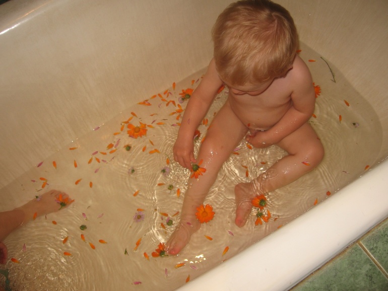 Купались в цветах календулы. Тиме пришлось выбирать ее из общей кучи цветов. Он справлялся с задачей хорошо, пока не надоело.