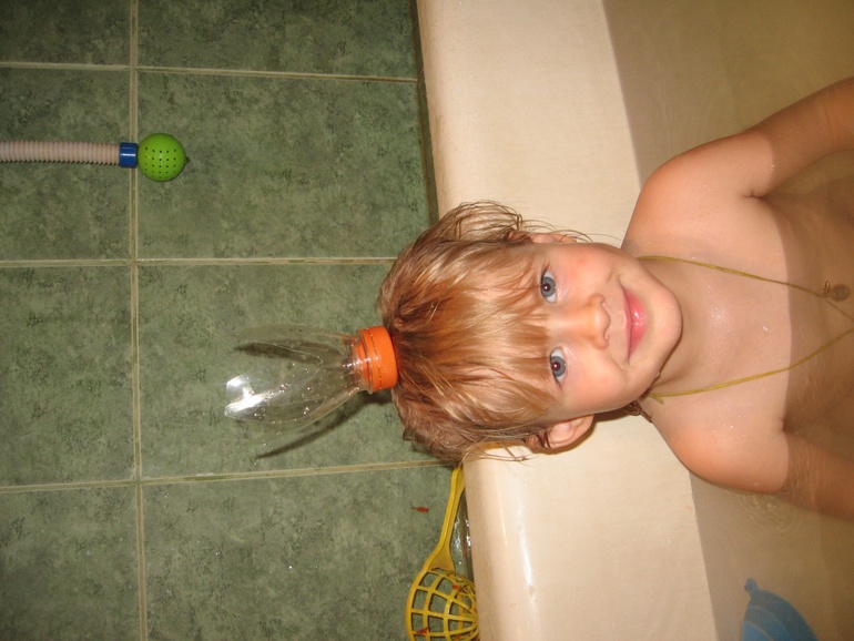 Тима получил новую тару для игр с водой - папа сделал кувшинки из пластиковых бутылок. А Лида сказала, что это короны и пробовала носить ее на голове. Я ей рассказала, что настоящая королева умеет голову держать настолько прямо, что корона у нее не сваливается даже будучи не закрепленной. Дочь начала тренироваться и вскоре у нее были неплохие рез-ты.