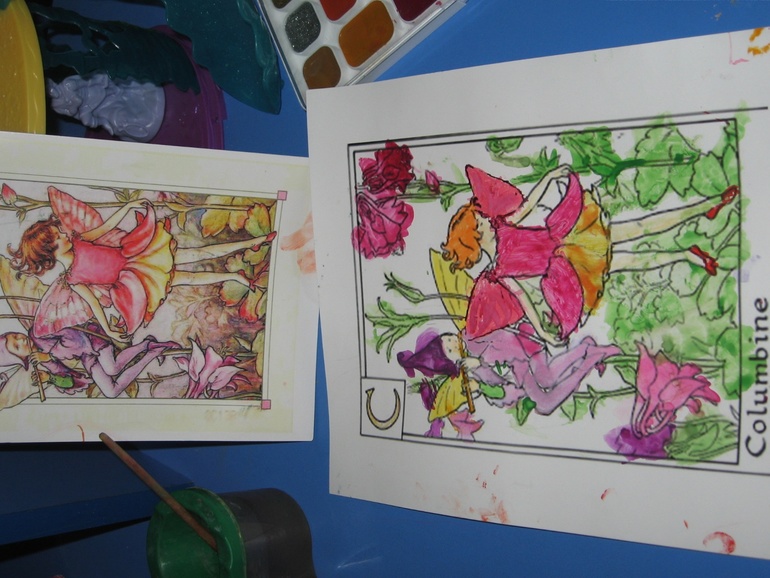 На четвертый день мы сажали тюльпаны. Раскрашивали картинку фея и эльф. По образцу. Дочь старалась правильно подобрать цвета («Они же такие нежные»»).