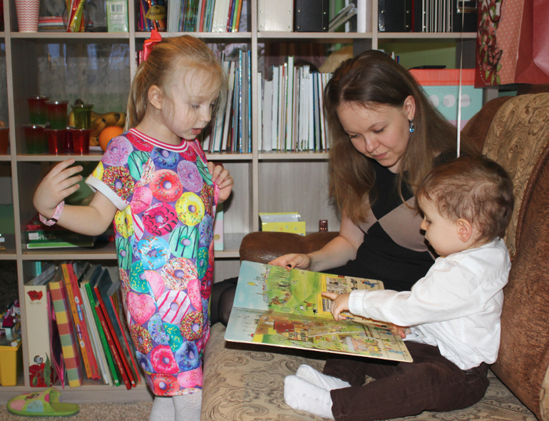 Читает мишке книжку.