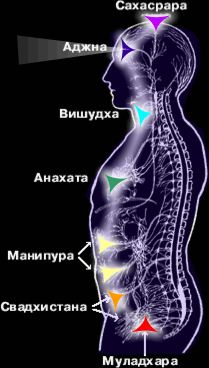 (1000-а лепестная «сахасрара»). Цвет-фиолетовый. Здесь вновь наблюдается некоторое расхождение с западным трактованием расположения чакры. Последние склонны объединять ее с сухожильным шлемом на черепном своде. Тогда как в действительности необходимо понимать, что сухожильный шлем, вместе с сосудисто-нервно-двигательным центром, расположенным в основании черепного свода, есть лишь спроецированные точки акупунктурного воздействия. Тогда как сама чакра расположена на расстоянии одного сантиметра над теменем (дыра Брамы). Истинная трактовка этой чакры видится скорее в изображении нимба над головами святых в иконописи, чем «надетым» на человека сухожильным шлемом. Значение седьмой чакры - координирующее. Это контролер, или распорядитель, всей сложнейшей системы, - именуемой человеком, - куда входят все его составляющие элементы. В ведении этого центра, находятся прежде всего центральная и периферическая нервные системы. Основные выполняемые функции - психика и связь с Надсознанием. Это своего рода приемник и распределитель эгрегориальной энергии и всей поступаемой информации, за счет связи с Надсознанием. Благодаря чему седьмую чакру называют еще сверх-чакрой, или над-чакрой. Именно с ее помощью происходит подключение к всеобщему информационному полю Земли и Вселенной. Верующие не зря усматривают в нимбе святых - «открытые врата духовных преобразований», но только открыть эти врата, человек должен САМ! Давайте теперь рассмотрим взаимодействие этих главных энергетических центров в целом, которое можно свести к следующей формуле, идущей снизу вверх: - Гордость, Жалость, Страх - на витальном уровне и то же самое, с точностью до наоборот, на ментальном уровне -Альтруизм, Любовь, Мудрость. Плюс Сверхментальность или связь с Богом. По сути, идет трансформация одних и тех же чувств, но на более высоком уровне. Особенно показательна здесь трансформация первой чакры. Гордость - или давление собственного «Я» витального плана, на ментальном уровне трансформируется в Альтруизм, т.е. любовь к другим людям (вспомним, что четвертая чакра - это центр единения с социумом), а на высшем, сверхментальном уровне, это же чувство (любовь к людям), трансформируется в еще более возвышенное чувство Любовь к Богу, или единение со всей Вселенной. Точно так же Жалость (ах какой бедненький песик, наверное голодный и ... прошли мимо), трансформируется в Любовь (возьму к себе этого песика, или хотя бы накормлю его и обогрею), а Страх (боязнь будущего, людей, стихий и т.д.), перерастает в Мудрость (если знаешь причину возникновения грома и молний, то стоит ли бояться их?). Человек, привязанный лишь к витальному плану, живет менее полноценной жизнью, чем человек, более гармоничный во всех отношениях. Не говоря уже о том, что «засоренность» тех или иных энергетических центров грозит развитием всевозможных патологий на уровне психосоматики