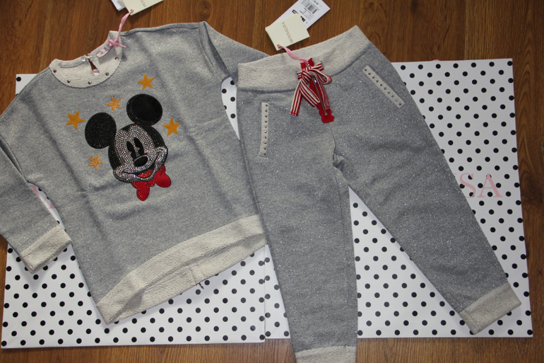Продам новый костюм с Микки, размер 4 (104), но ориентироваться лучше по замерам: кофточка 48,5, рукав от горловины (он спущенный, по-другому не измерить) 44, ширина 34,5. Брючки: общая длина по боковому шву 57,5, шаговый 40,5.