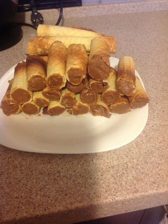 Хочу,как в детстве.Помню,как мама пекла вафли,сворачивала трубочкой и заполняла сгущёнкой с орехами.Мммм...Няма.))