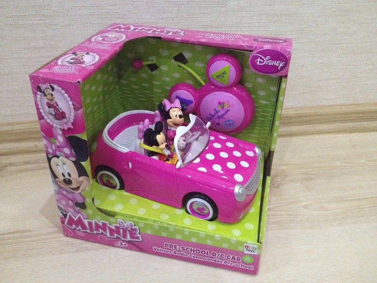 На капоте у нее три шестеренки, которые можно крутить, также изображения Микки и Минни Маус, телефонная трубка, крутящиеся ручки, экранчик, крутящийся барабан с рисунками, окошко, кнопки, ключ зажигания и рычаг. А на руле - гудок. Нажав на кнопки или гудок, можно услышать приятную мелодию. Ключ зажигания во включенном состоянии издает звуки работающего мотора. На панели каталки имеются развивающие подвижные детали, часы, телефон. На руле имеются кнопки со встроенными звуковыми и световыми эффектами. Сиденье каталки поднимается и там имеется отсек для хранения игрушек.