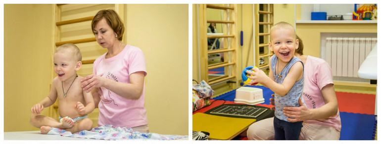 С помощью инструктора малышка учится удерживать равновесие на мяче, самостоятельно вставать в полный рост, прямо стоять, делать шаги. Задача этих упражнений - "рассказать" мышцам, что они умеют и научить их работать. А занятия на виброплатформе Галилео укрепляют мышцы и повышают их тонус.