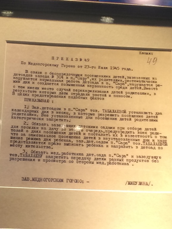Среди экспонатов, представлен приказ о посещении детского сада родителями.